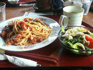 鶏肉とナスのチリトマトソースパスタ+野菜スープ+サラダ+食後のコーヒーのセット。